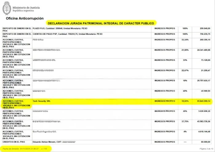 Pese a haber salido formalmente de la empresa, en la DDJJ anual presentada en noviembre de 2024 Martín Menem incluyó su participación en Tech Security (15,66%) al inicio del período, valuada en $91.845.595,74, la cual desaparece hacia el cierre del año.