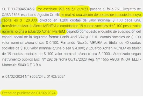 Sin embargo, el Boletín Oficial de la República Argentina publicó el 1° de febrero de 2024 la escritura del 6 de diciembre de 2023, donde consta la venta de sus acciones en Tech Security a su hermano Eduardo Adrián Menem. La sociedad quedó entonces conformada por Pablo Ariel Vázquez y los hermanos de Martín, Eduardo Adrián y Fernando “Tato” Nicolás.